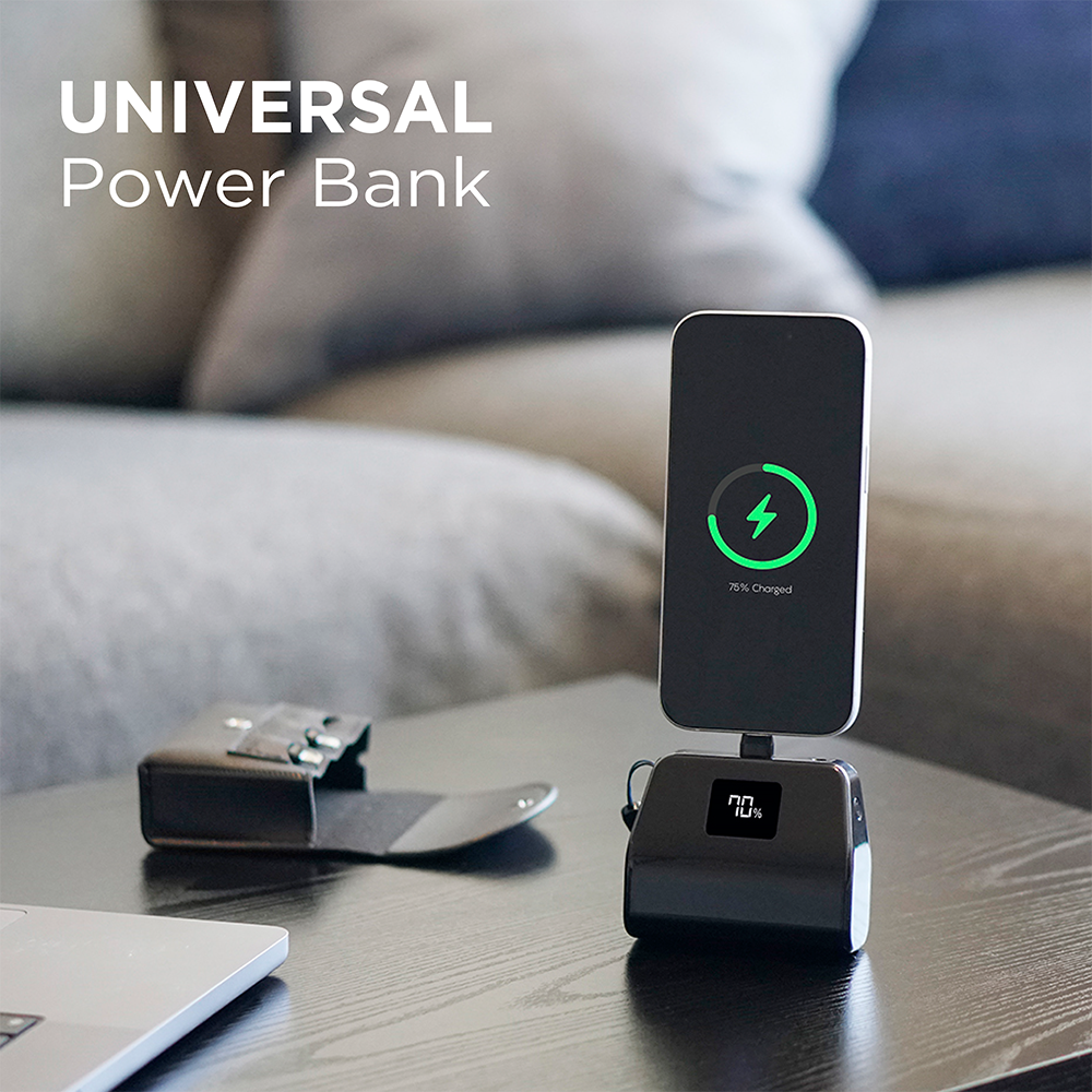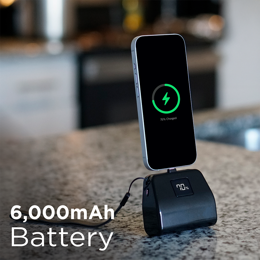 Say goodbye to tangled cords and bulky chargers—with the TotalBoost Mini Pro II, everything you need is built right in. This sleek, ultra-portable power bank keeps you powered up anywhere, anytime—no extra cables required. Equipped with built-in interchangeable charging adapters (Type-C, Lightning, and Micro-USB), the TotalBoost Mini Pro II delivers complete compatibility for virtually any mobile device. The powerful 6,000mAh rechargeable battery provides multiple charges for your phone, earbuds, or other devices, while its cable-free design lets you move freely and charge with ease. Featuring a digital battery display, kickstand with magnetic closure, and mini flashlight, this compact powerhouse combines functionality, portability, and convenience in one smart design. Slip it into your pocket, purse, or travel bag—and stay connected wherever life takes you.